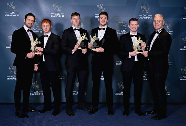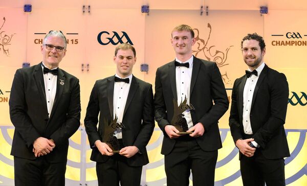 GPA Chief Executive Officer Tom Parsons, left, and Uachtarán Chumann Lúthchleas Gael Jarlath Burns, right, present Kildare footballers, from left, Harry O'Neill, Darragh Kirwan, Kevin Feely and James McGrath with their Tailteann Cup of the Year Awards