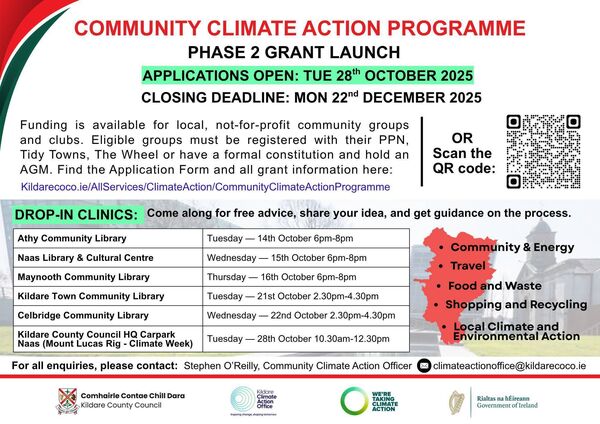 Stephen O’Reilly, community climate action officer, Kildare County Council said: “Following a strong first round, Kildare County Council is inviting applications for round two. With €897,000 available again, we aim to support practical, locally focused projects that deliver clear community and climate benefits. For many groups, their work would not be possible without this funding, and we look forward to meeting potential applicants at the upcoming October library clinics.” Applications are open for the community climate action programme from 28 October to 22 December.