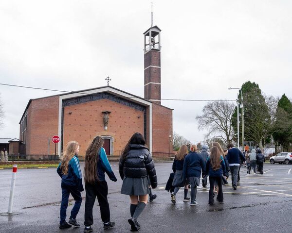Students organised outside the school on Tuesday afternoon 27 January, before staging the walk to the nearby church – joined by teachers and parents